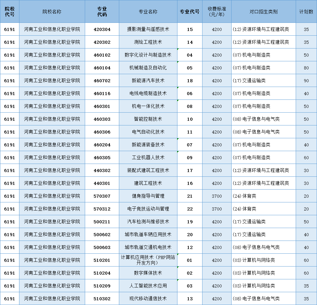 2025年河南工业和信息化职业学院对口专科招生志愿填报专业代号对照表